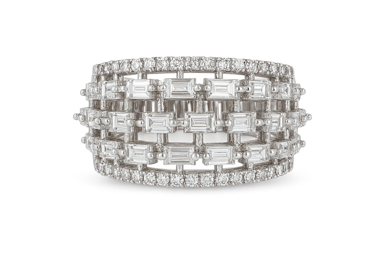 Anillo en Oro Blanco 18 kltes. 750mlm. 3,3 Kilates en total de diamantes Baguettes y Princess. Ancho: 11 mm. Bagu./bril SI1 H